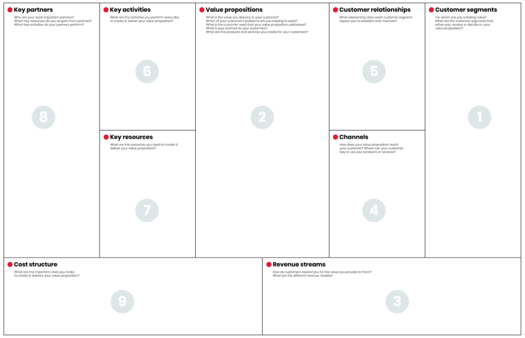 Met het ๐—•๐˜‚๐˜€๐—ถ๐—ป๐—ฒ๐˜€๐˜€ ๐— ๐—ผ๐—ฑ๐—ฒ๐—น ๐—–๐—ฎ๐—ป๐˜ƒ๐—ฎ๐˜€ maak je een ondernemingsplan in een A4. Je brengt je bedrijfsplan overzichtelijk in kaart met 9 bouwstenen. Daarin beschrijf je jouw bedrijf en onder meer het verdienmodel, de toegevoegde waarde, klanten, relaties en leveranciers.